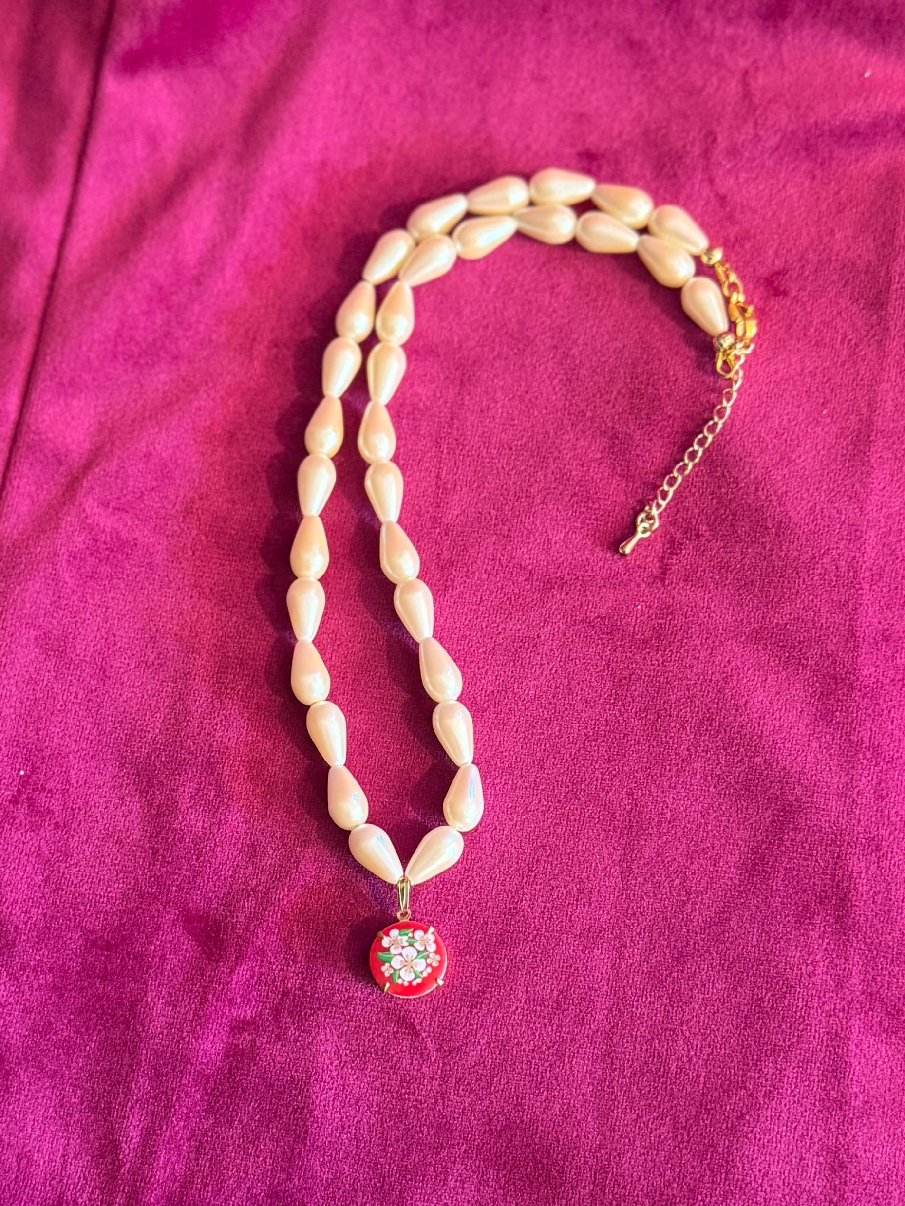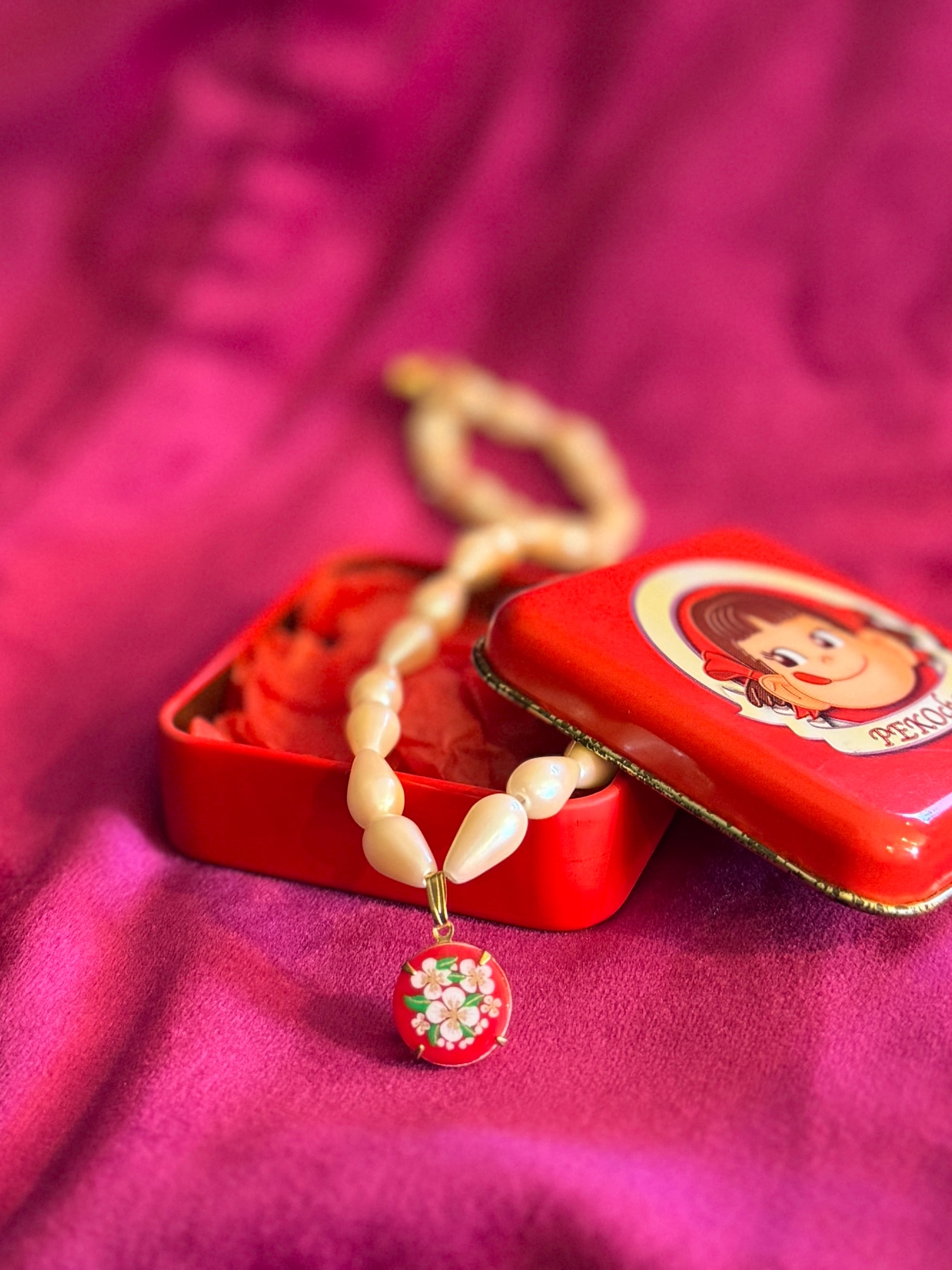 【一点物】《入れ物付き》Tシャツに合わせてほしいパールネックレス〜小さい花 Red〜