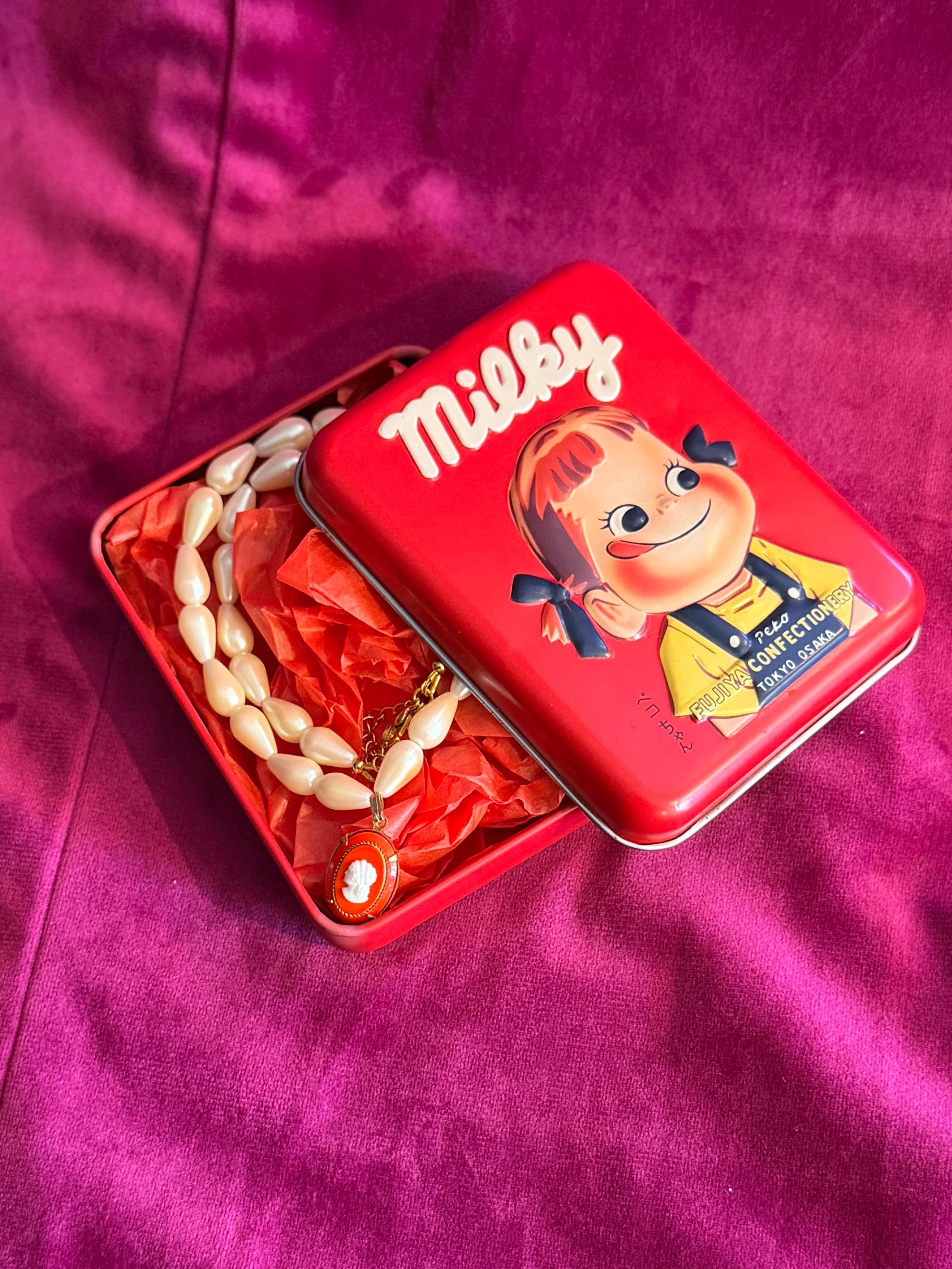 入れ物は、このネックレスに合うものを古道具屋さんを巡り集めたものです