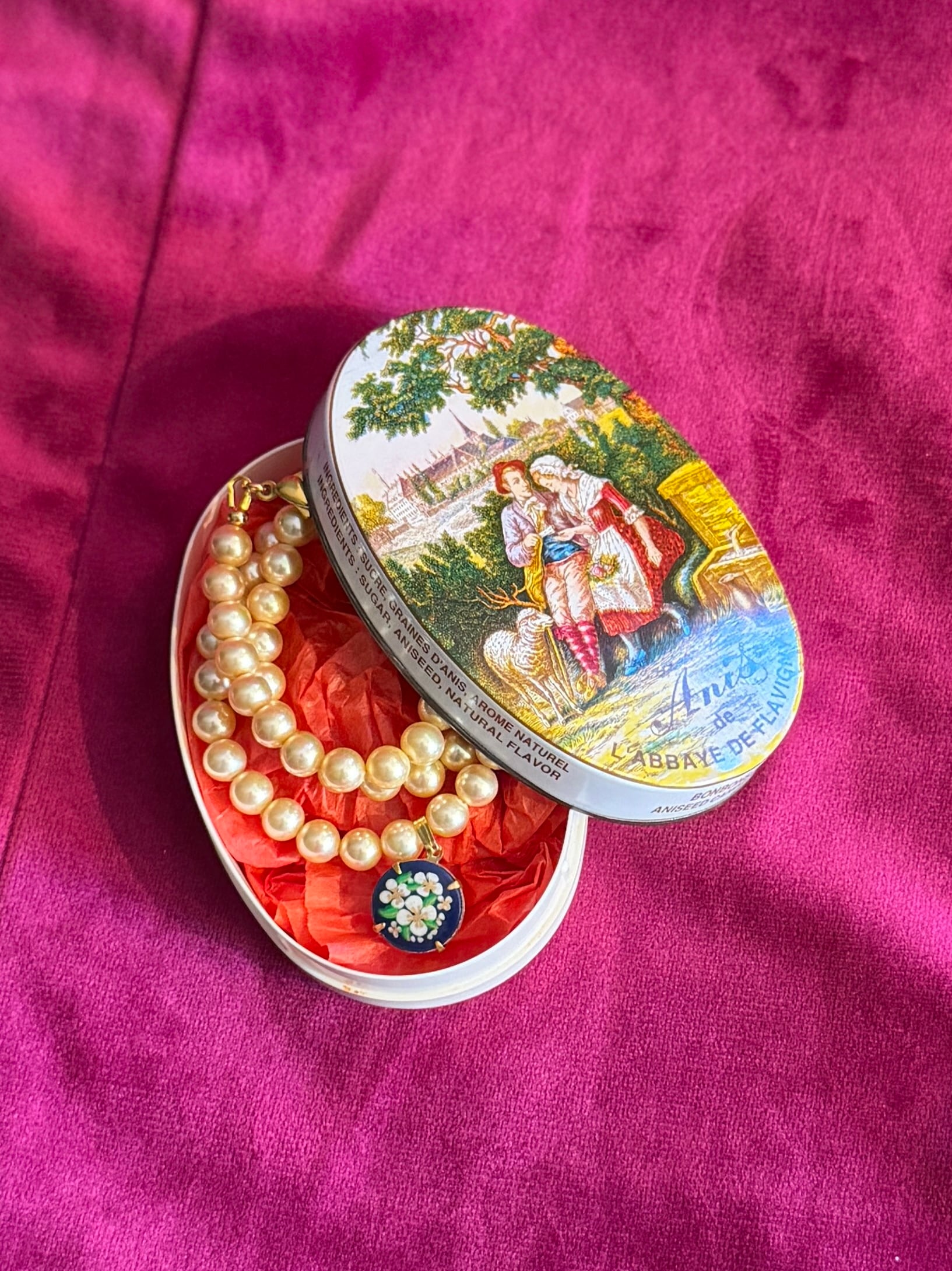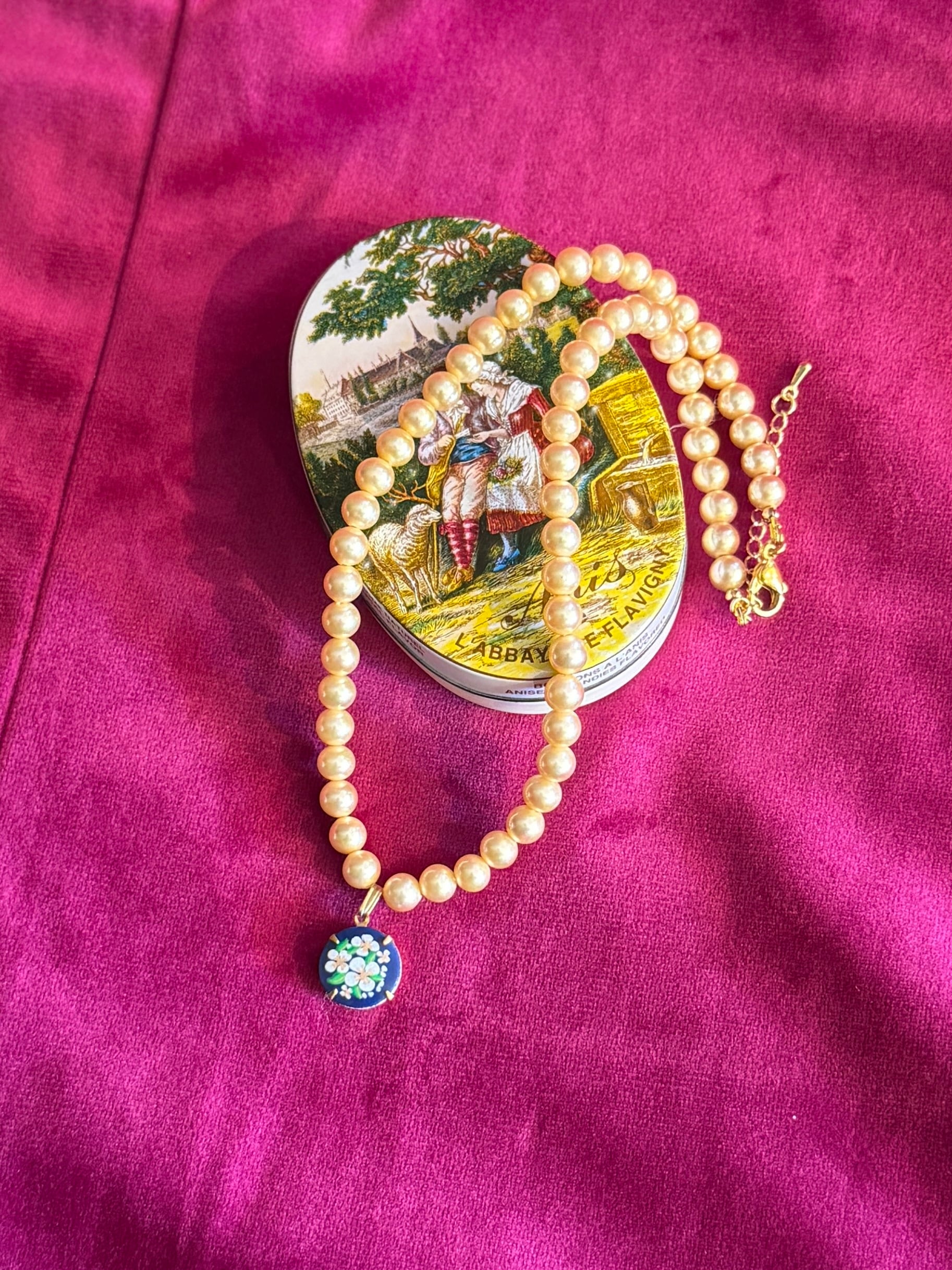 入れ物は、このネックレスに合うものを古道具屋さんを巡り集めたものです